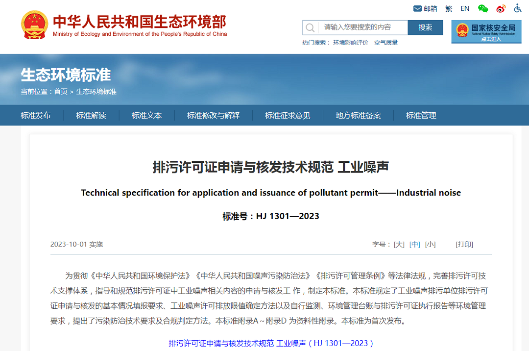 生態(tài)環(huán)境部發(fā)布《排污許可證申請與核發(fā)技術(shù)規范 工業(yè)噪聲》(HJ1301-2023)