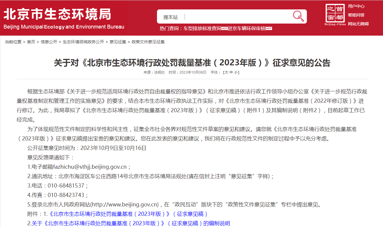 北京市生態(tài)環(huán)境局正就《北京市生態(tài)環(huán)境行政處罰裁量基準(2023年版)》廣泛征求意見(jiàn)(圖文)