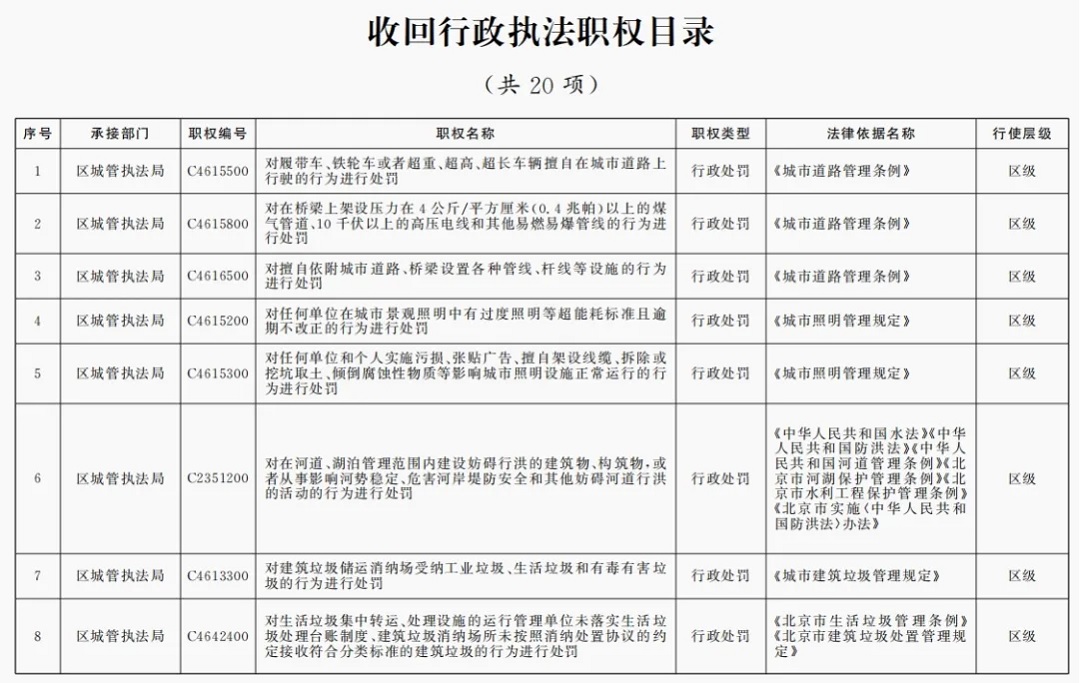 根據《中華人民共和國行政處罰法》《中華人民共和國行政強制法》及《北京市街道辦事處條例》等相關(guān)法律法規規定,按照黨中央全面建立鄉鎮(街道)履行職責事項清單統一部署,切實(shí)為基層減負,市政府決定,收回一批下放到鄉鎮(街道)的行政執法職權,具體內容如下: