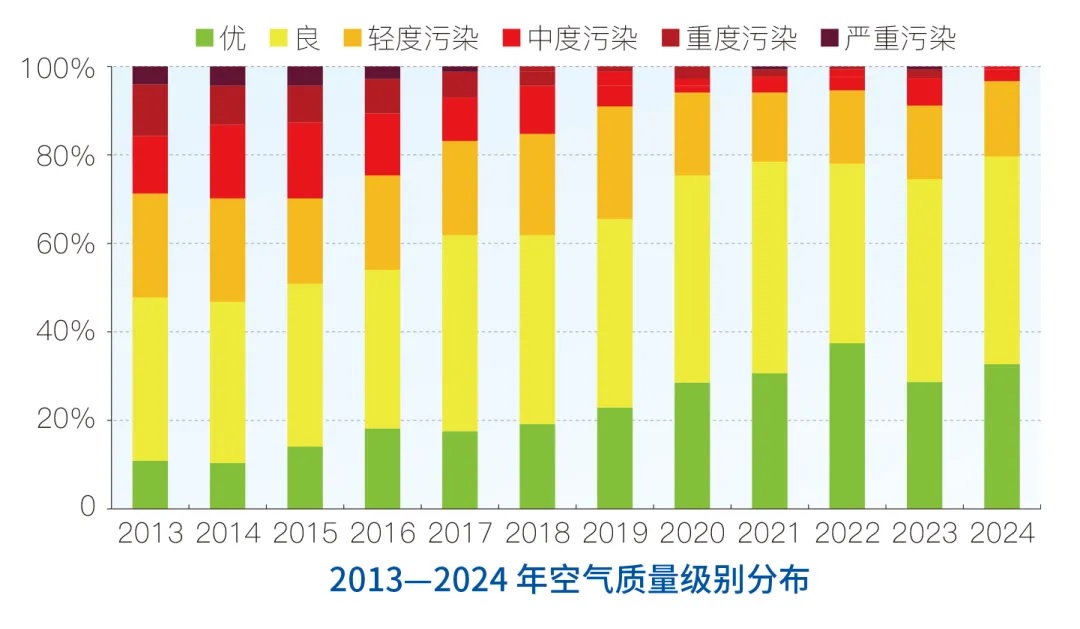 2024年,北京市大氣環(huán)境中細顆粒物(PM2.5)年均濃度為30.5微克/立方米、連續四年達到國家空氣質(zhì)量二級標準,二氧化硫(SO2)、二氧化氮(NO2)和可吸入顆粒物(PM10)多年穩定達標。與2013年相比,2024年四項主要污染物年均濃度均下降一半以上,其中PM2.5年均濃度下降了65.9%。2024年的優(yōu)良天數為290天,為歷年最多。重污染天2天,為歷年最少。
