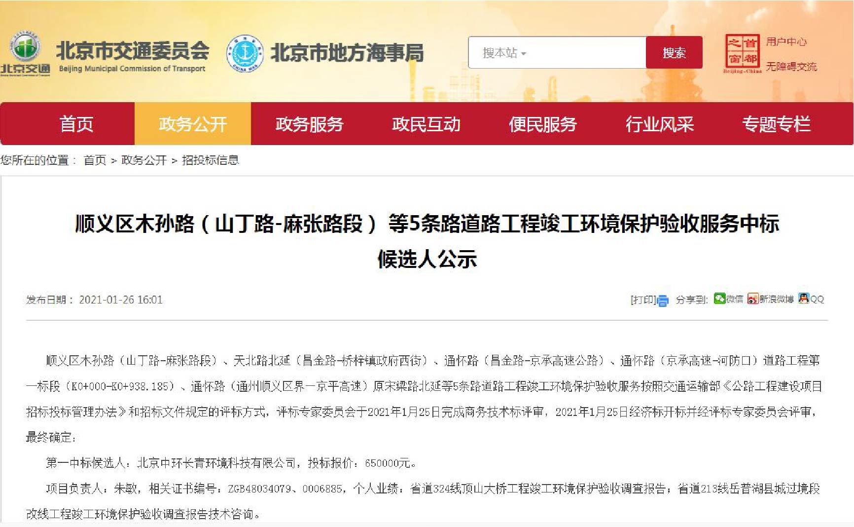 中環(huán)長(cháng)青中標北京市交通委員會(huì )順義公路分局5條道路環(huán)保驗收項目