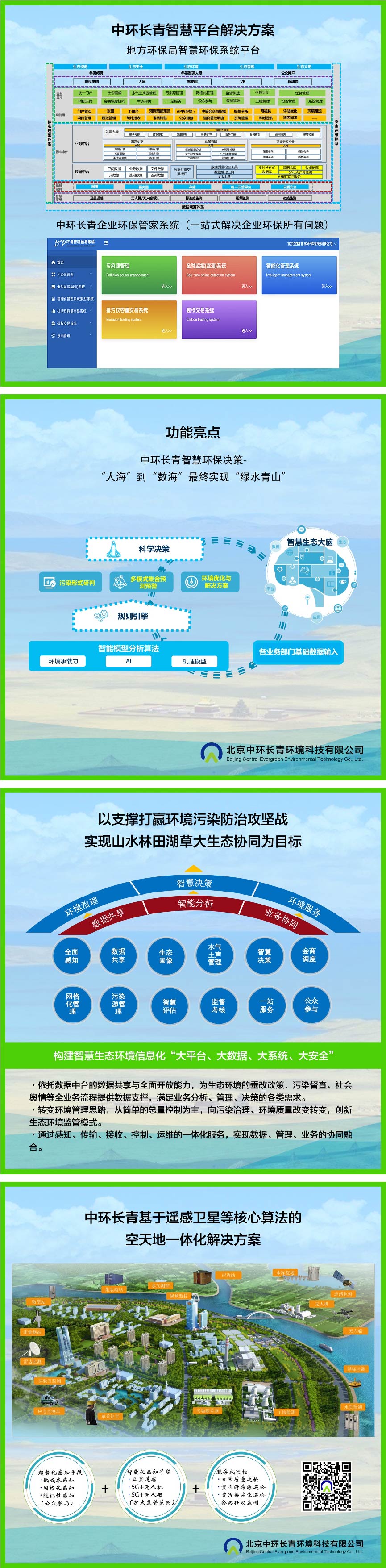 目前中環(huán)長(cháng)青環(huán)境管理信息平臺覆蓋有“區域空氣環(huán)境質(zhì)量(無(wú)組織排放智慧監測及管控)、水環(huán)境服務(wù)(河流水質(zhì)污染監測分析、黑臭水體監測、污染源分部監測、飲用水水源地保護區域遙感動(dòng)態(tài)變化監測、湖庫型水源地富養營(yíng)養化動(dòng)態(tài)變化監測等)、區域環(huán)境特征物污染溯源服務(wù)(溯源污染成分分布監測、區域時(shí)空污染分布規律分析、當量企業(yè)污染排放分布圖和量化排名、外來(lái)輸入性污染傳輸通道分析、大氣污染應急響應評估、大氣污染成因分析與污染源治理管控措施、大氣污染氣團軌跡分析、重點(diǎn)污染區域監測等)、城市固廢監測及提取服務(wù)、城市綠化管理監測服務(wù)、地災遙感監測”等行業(yè)領(lǐng)先的技術(shù)服務(wù)。