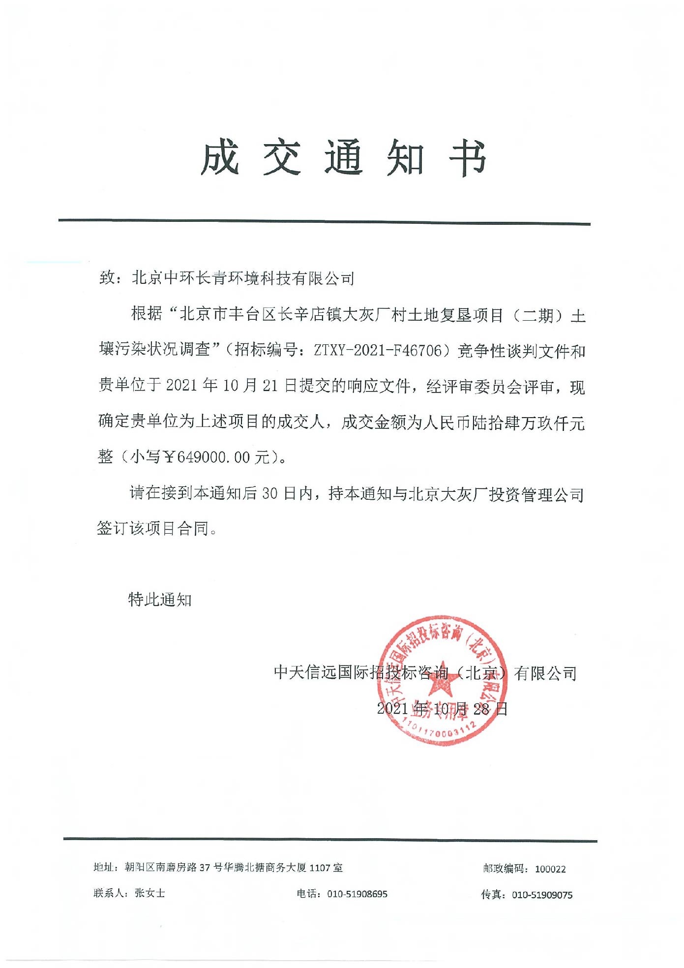 2021年10月28日,公司憑借突出的業(yè)績(jì)、雄厚的技術(shù)實(shí)力以及良好的市場(chǎng)信譽(yù)成功中標北京市豐臺區長(cháng)辛店鎮大灰廠(chǎng)村復墾項目(二期)土壤污染狀況調查項目。感謝客戶(hù)對我公司的認可和信任!這是對我公司綜合實(shí)力,技術(shù)水平和團隊凝聚力的又一次肯定。公司將始終秉承“科學(xué)嚴謹、客觀(guān)公正、優(yōu)質(zhì)高效”的質(zhì)量方針,以一流的技術(shù)和服務(wù)回饋客戶(hù),打造更多精品工程。
