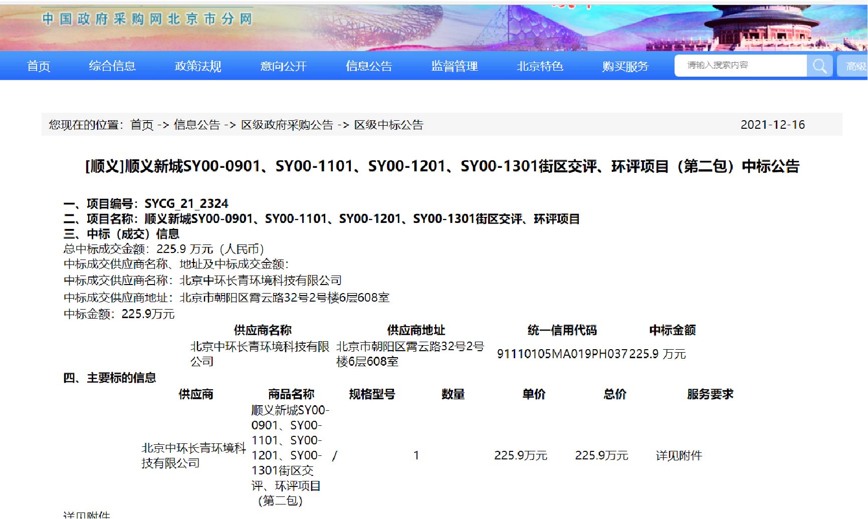 2021年12月16日,接招標單位正式通知:北京中環(huán)長(cháng)青規劃環(huán)評團隊中標順義新城SY00-0901、SY00-1101、SY00-1201、SY00-1301街區規劃環(huán)境影響評價(jià)項目;中標金額225.9萬(wàn)元。