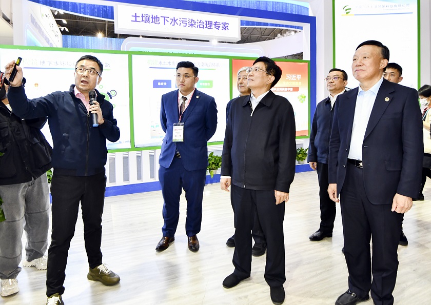 孫金龍書(shū)記率隊巡館的首站,即來(lái)到中環(huán)豐清展區;了解國家地下水污染防治試驗區的情況、了解中環(huán)豐清技術(shù)團隊在土壤、地下水行業(yè)“強化源頭防控,堅持城鄉統籌,持續深入打好凈土保衛戰”方面的技術(shù)特色、了解地下水污染行業(yè)新技術(shù)、新業(yè)態(tài)的發(fā)展模式。中環(huán)豐清董事長(cháng)穆彬首先感謝孫金龍書(shū)記首站蒞臨指導和親切指示,結合工作成果展板和多媒體材料,以“查、測、溯、治、管、服、控”閉環(huán)技術(shù)協(xié)同為主題,向孫金龍書(shū)記具體匯報技術(shù)團隊在土壤、地下水污染防治方面的從業(yè)體驗與現階段取得的技術(shù)成果。