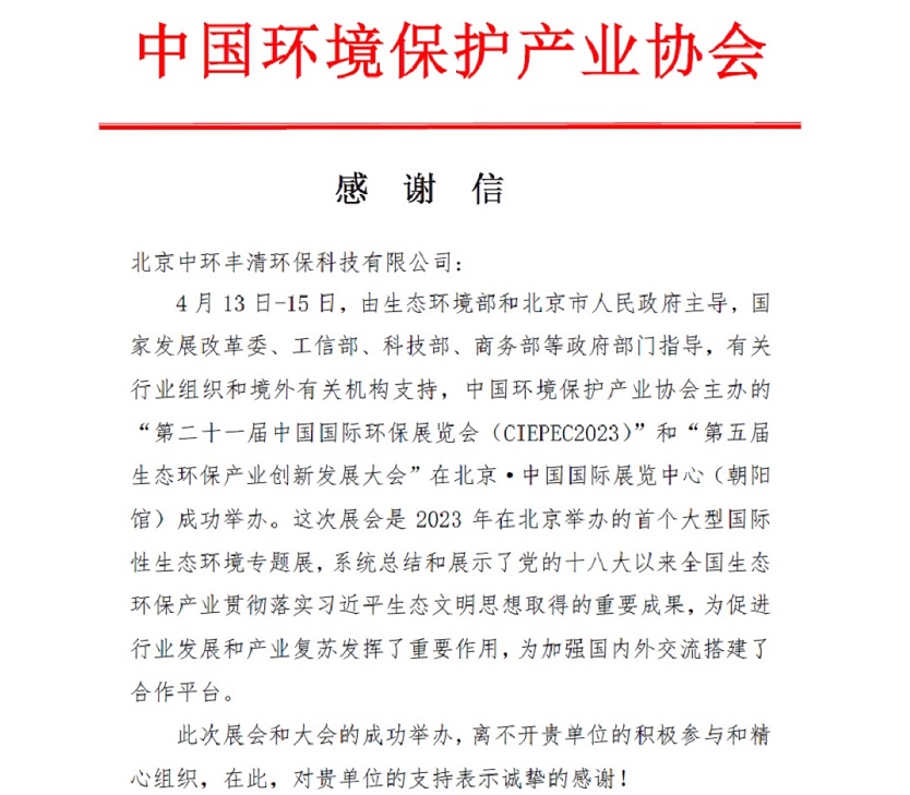 中環(huán)環(huán)保產(chǎn)業(yè)協(xié)會(huì )給中環(huán)豐清發(fā)函感謝在中國國際環(huán)保展(CIEPEC2023)中給予的支持和協(xié)助