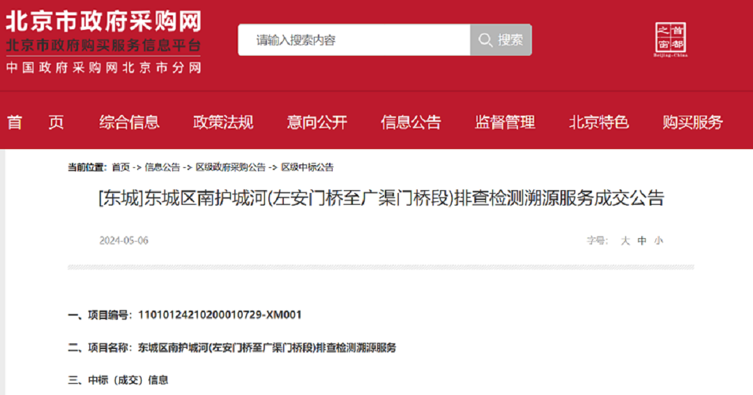 2024年5月6日,經(jīng)過(guò)磋商小組評審,北京中環(huán)長(cháng)青環(huán)境科技有限公司成功中標“東城區南護城河(左安門(mén)橋至廣渠門(mén)橋段)排查檢測溯源服務(wù)”項目。