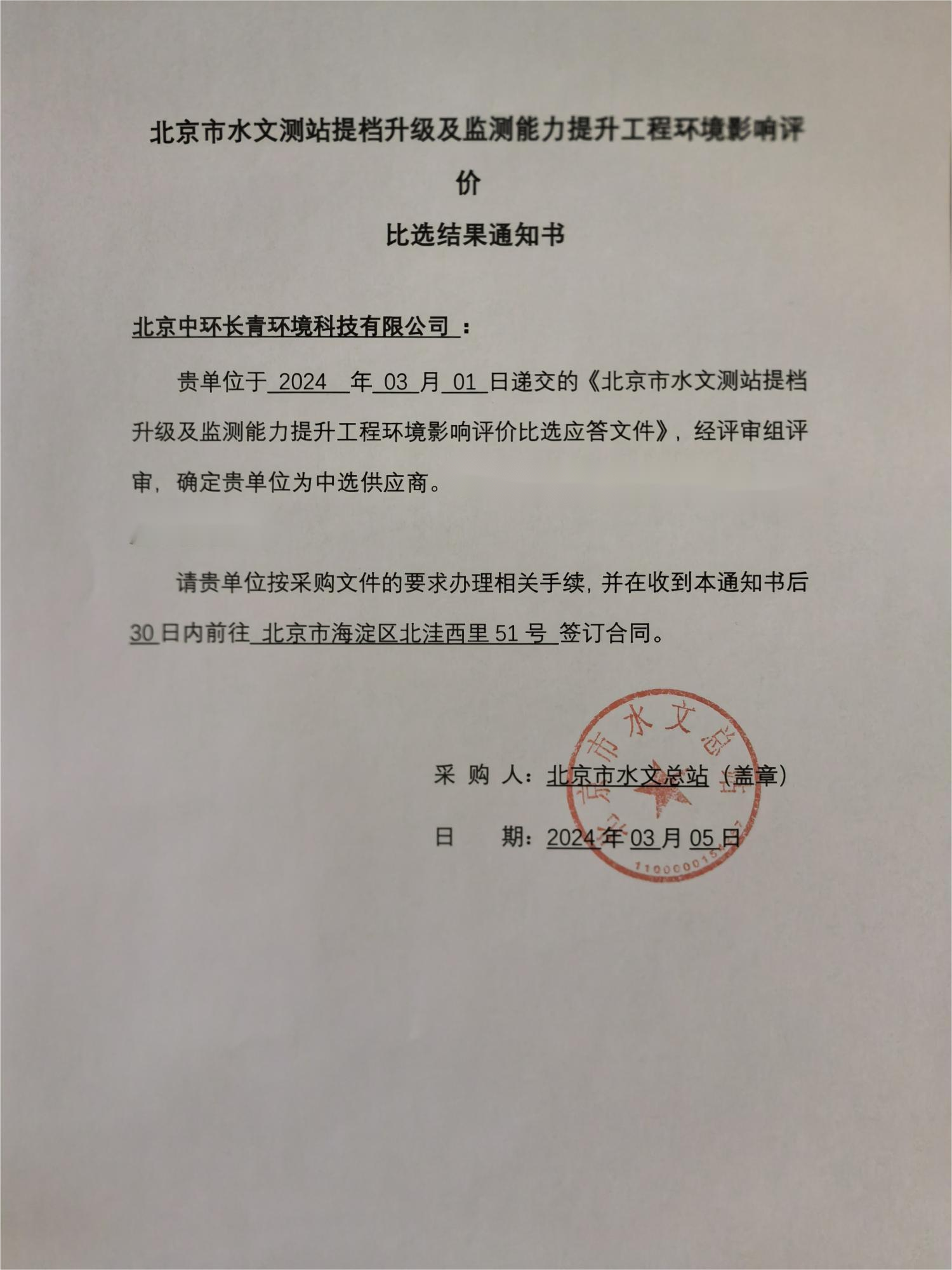 日前,北京中環(huán)長(cháng)青環(huán)境科技有限公司參加了北京市水文總站組織的《北京市水文測站提檔升級及監測能力提升工程環(huán)境影響評價(jià)項目》的招投標事宜,按照要求遞交了比選應答文件,經(jīng)評審組評審,最終確定北京中環(huán)長(cháng)青環(huán)境科技有限公司為中選供應商。